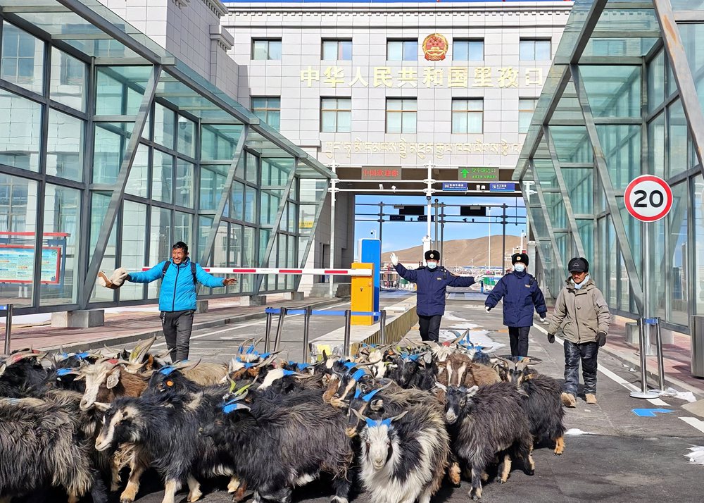 下午時分,一批出口活羊等待出境。關(guān)員拉巴頓珠戴著口罩和手套,在羊群中穿梭,查看羊的毛色、精神狀態(tài),并不時用手觸摸羊的身體,感受其體溫是否正常。