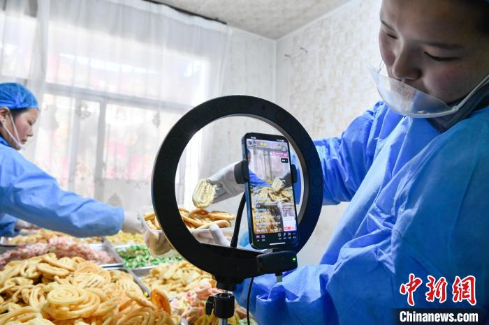 2月10日,西藏拉薩市林廓北路一家卡塞店里,工人在直播賣卡塞?!翱ㄈ笔且环N油炸面食,是藏歷新年必不可少的食物。隨著藏歷新年的日益臨近,古城拉薩各個(gè)加工銷售“卡塞”的店鋪飄出陣陣香味。中新社記者 貢嘎來(lái)松 攝