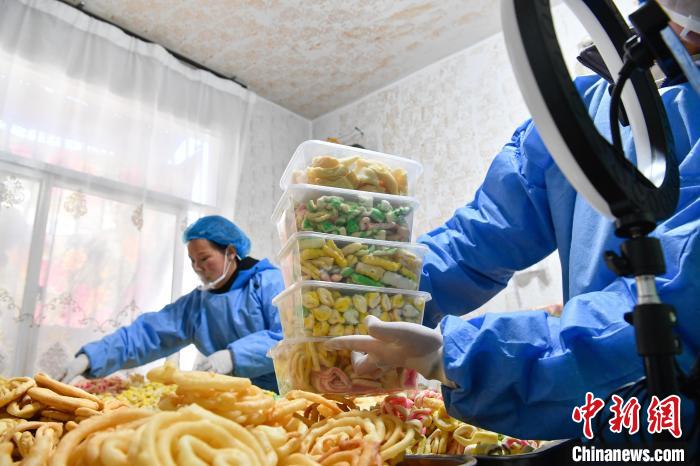 2月10日,西藏拉薩市林廓北路一家卡塞店里,工人在直播賣卡塞。“卡塞”是一種油炸面食,是藏歷新年必不可少的食物。隨著藏歷新年的日益臨近,古城拉薩各個(gè)加工銷售“卡塞”的店鋪飄出陣陣香味。中新社記者 貢嘎來(lái)松 攝