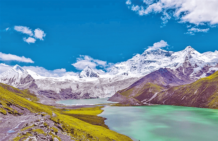 薩普雪山2016年才被發(fā)現(xiàn)并面世,是一處保護(hù)非常完整的天然冰川。其主峰海拔為6956米,北側(cè)有巨大的薩普冰川,冰川末端有一湖泊叫薩姆錯,海拔約4750米,薩姆錯分內(nèi)、外湖,內(nèi)湖為崗香童錯冰湖,終年不化,一年四季漂浮千年冰雕,形狀各異;外湖湖水碧綠,湖內(nèi)魚兒成群。