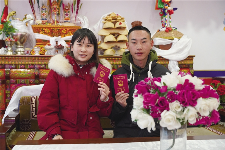 “我們在一起3年了,是表姐牽的紅線?!钡┰龈峦吣樕涎笠缰腋5男θ?,緩緩說道,“初次見到卓嘎,我就對她心生好感。相處一段時間后,我發(fā)現(xiàn)她性格溫柔,和我特別合拍,于是鼓起勇氣向她表白?!彼_心地展示著剛剛領(lǐng)到的結(jié)婚證,“情人節(jié)是個好日子,我們早就計劃好今天領(lǐng)證,現(xiàn)在終于如愿以償。以后情人節(jié)和結(jié)婚紀(jì)念日合二為一,既能少買一份禮物,也不用擔(dān)心忘記啦。”