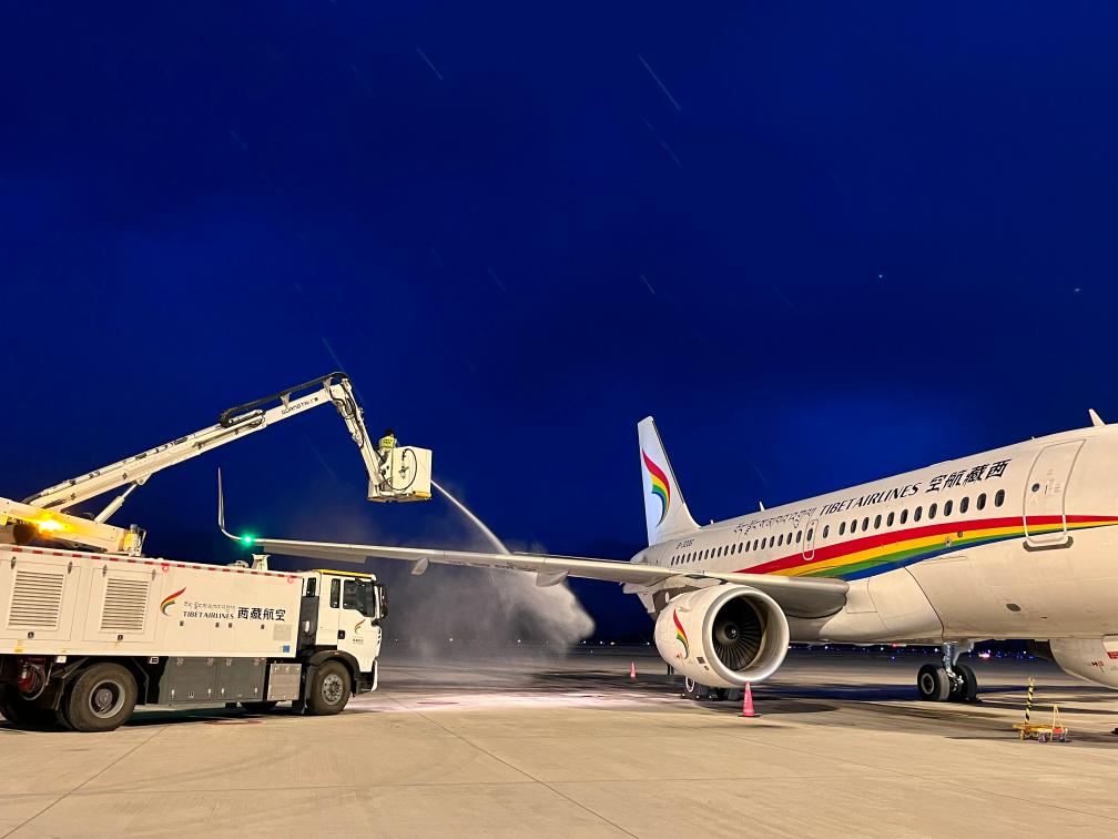 2月19日,停在拉薩貢嘎國際機場的TV9701航班。(民航西藏自治區(qū)管理局供圖)