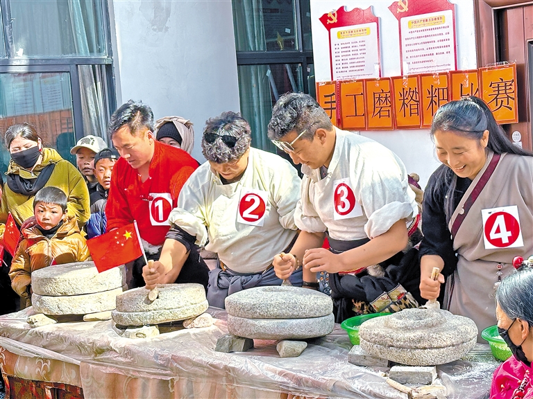 圖為比如縣“鄉(xiāng)村振興 那曲奮進(jìn)”手工磨糌粑比賽現(xiàn)場(chǎng)。 記者 趙書彬 萬(wàn)靖 攝