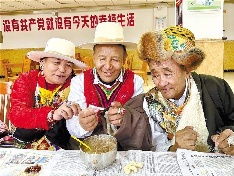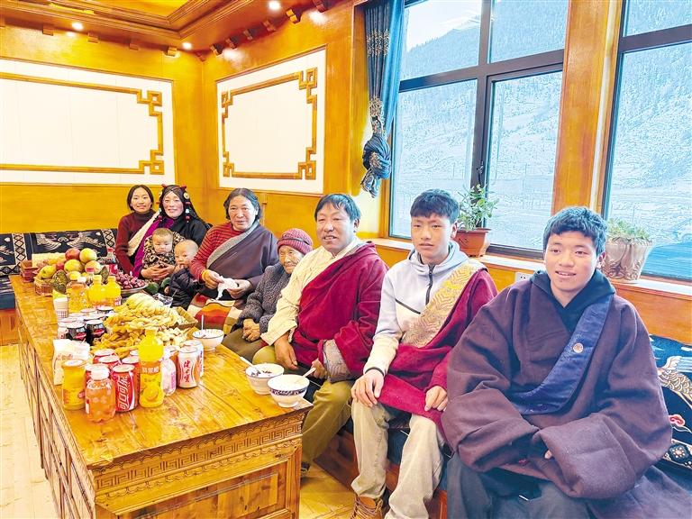 60歲的多吉大爺放牧歸來,推開家門,“古突”的香氣瞬間將疲憊驅(qū)散?!岸嫉烬R啦,吃‘古突’嘍!”大兒子格桑多吉一邊招呼,一邊給家人盛上“古突”。房間里,歡聲笑語不斷,處處充滿溫情。
