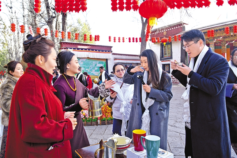 隨著一聲聲“扎西德勒!”“新年快樂!”的祝福語響起,身著盛裝的工作人員站在切瑪盒旁邊,熱情地教游客吃“切瑪”?!扒鞋敗焙欣餄M滿的青稞粒和糌粑,再加上金燦燦的酥油花和染成紅綠兩色的“羅薩梅朵”麥穗的裝點(diǎn),象征著五谷豐登、福澤綿長。來自廣東的游客張女士一家是專程趕來過藏歷新年的,想來體驗(yàn)不同年味兒的她輕捏一撮切瑪撒向空中:“愿我們?nèi)医】灯桨玻沧W鎳睒s昌盛!”