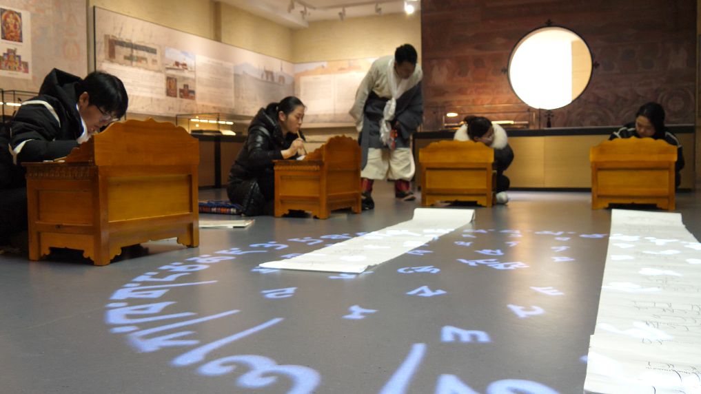 2月28日是藏歷新年初一,市民和游客在西藏博物館展廳參加藏文書法互動(dòng)體驗(yàn)活動(dòng)(2月28日攝)。新華社記者吳思思 攝