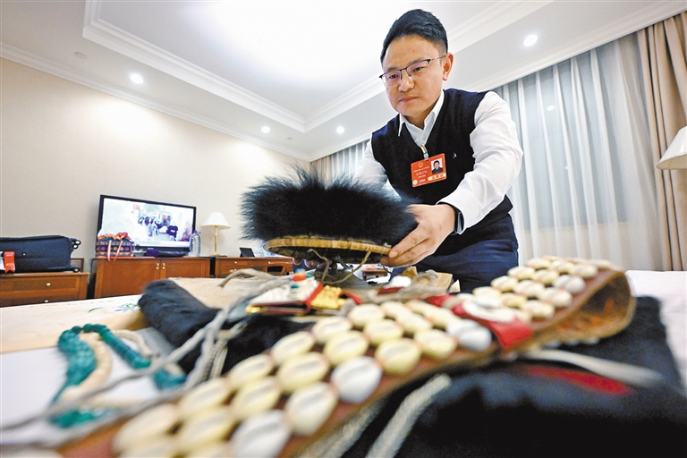 全國人大代表扎西江村在準(zhǔn)備參會時穿的民族服飾。
