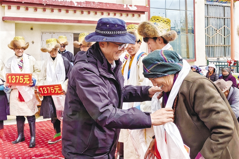 “羅薩扎西德勒!這是您家的分紅款!”定結(jié)鄉(xiāng)黨委副書記、鄉(xiāng)長(zhǎng)高文雄為75歲的村民央金遞上分紅紅包并表達(dá)自己的祝福。長(zhǎng)桌上,“卡賽”、青稞酒擺成“豐收塔”;長(zhǎng)桌旁,8.8萬元分紅款化作“新年紅包”,村民們揣著紅包看表演,共同分享村集體經(jīng)濟(jì)發(fā)展的豐碩成果,藏歷新年的喜慶與鄉(xiāng)村振興的碩果在此刻交融。