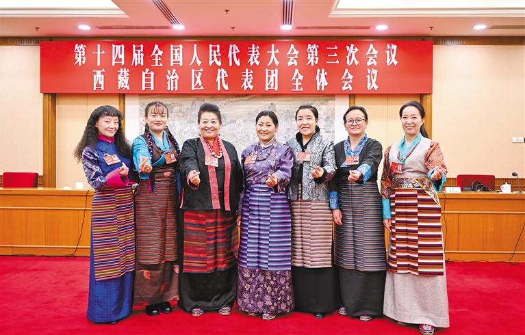 圖為西藏全國人大代表中的“七朵金花”在西藏代表團主會場合影留念,并祝福全區(qū)婦女同胞“三八”國際勞動婦女節(jié)快樂。記者 旦增西旦 攝