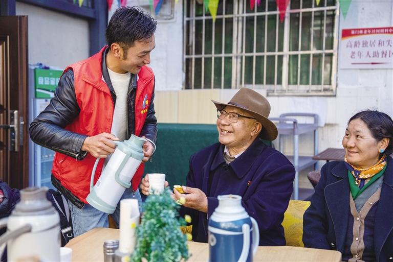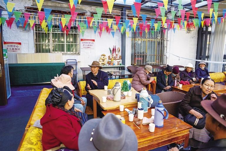 “波啦,您來啦,快坐下來喝點(diǎn)熱茶。”“莫啦,待會午飯?jiān)谶@邊吃嗎?”近日,記者來到拉薩市城關(guān)區(qū)蕃陽社會工作者和志愿者服務(wù)協(xié)會下的策門林老年日間照料中心,剛進(jìn)大門就被一群正在鍛煉身體的老人所吸引。他們跟著老師抬手、踢腿、扭腰,動作整齊劃一,臉上洋溢著幸福的笑容。鍛煉結(jié)束后,赤來回到助餐區(qū),邊喝甜茶邊吃“卡賽”,和老人們分享趣聞,拉著家常,現(xiàn)場傳來一陣陣歡聲笑語。