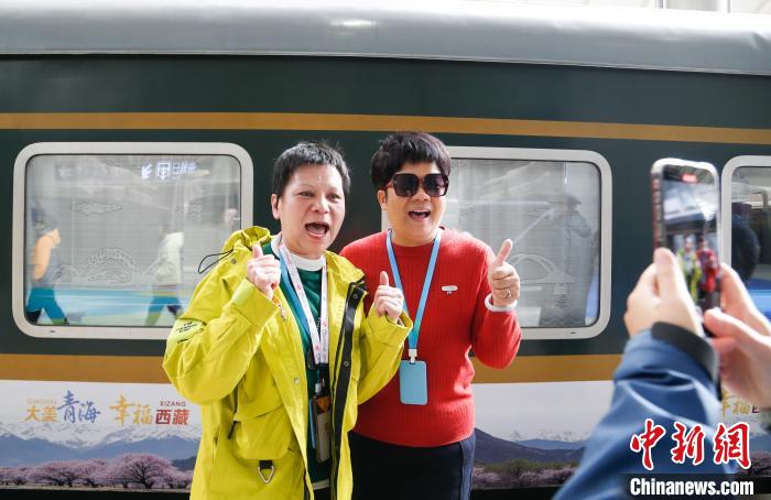 3月26日,乘坐青海首趟直達(dá)西藏林芝旅游專列的旅客與列車(chē)合影留念?!●R銘言 攝