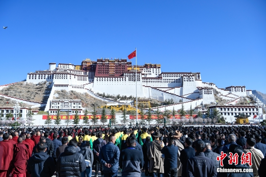 3月28日,西藏各族各界人士聚集在拉薩布達(dá)拉宮廣場,升國旗、唱國歌,參加西藏百萬農(nóng)奴解放66周年紀(jì)念活動(dòng)。圖為升國旗儀式現(xiàn)場。