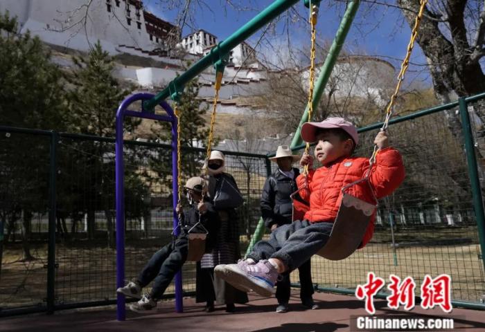 2025年3月13日,小朋友在西藏拉薩宗角祿康公園蕩秋千。坐落于布達拉宮腳下的宗角祿康公園是拉薩民眾戶外活動的一大場所。中新社記者 李林 攝