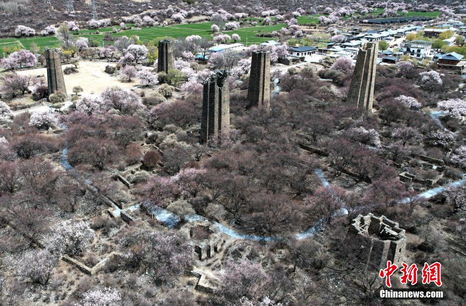 秀巴古堡位于西藏林芝市工布江達(dá)縣,是古代的軍事設(shè)施,距今已有1600多年的歷史。時(shí)下,古堡之下遍布的桃花競(jìng)相綻放,粉白桃花點(diǎn)綴著滄桑古堡,景色壯麗。圖為4月5日,秀巴古堡群下桃花綻放。(無(wú)人機(jī)照片)中新社記者 李林 攝