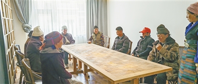 德吉村村民在新修建的民宿內(nèi)商量下一步民宿如何發(fā)展。西藏自治區(qū)民委供圖