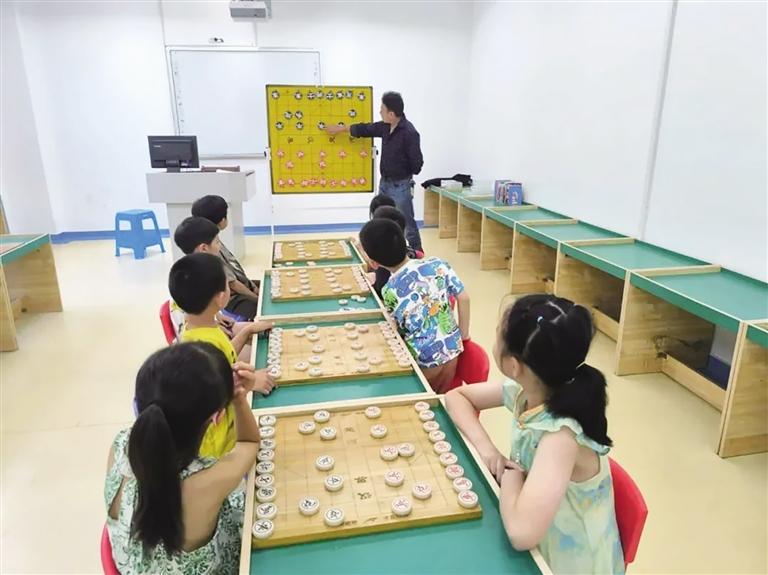 象棋興趣班上學(xué)生認(rèn)真聽(tīng)老師講課。