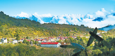 格林村與遠處的雪山、近處的森林共同構成一幅生態(tài)畫卷。黃家斌攝