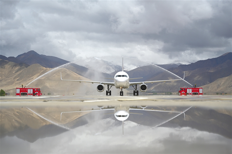 圖為5月1日,“上?!湛t”航線首航飛機在日喀則和平機場通過水門。記者 扎西頓珠 攝
