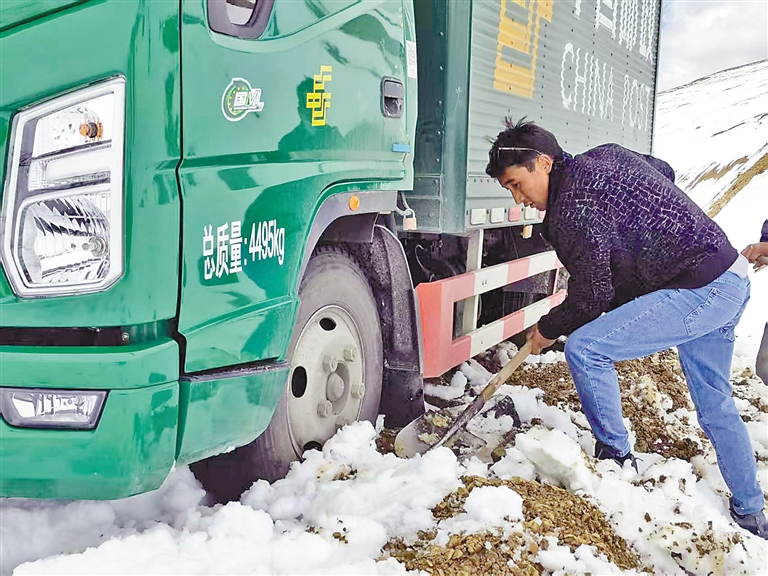 圖為巴桑頓珠在強(qiáng)拉山頂鏟雪,讓郵車(chē)脫困(資料照片)。