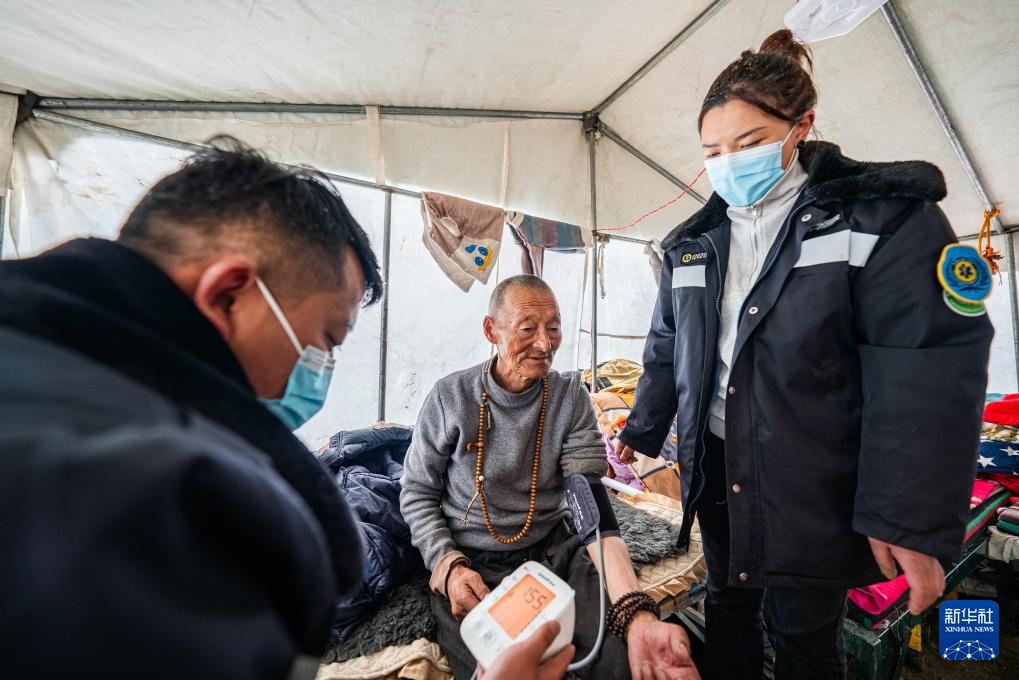 在那曲市索縣西昌鄉(xiāng),衛(wèi)生院醫(yī)務(wù)人員為蟲草采集點(diǎn)的牧民測(cè)量血壓(5月18日攝)。新華社記者 丁增尼達(dá) 攝