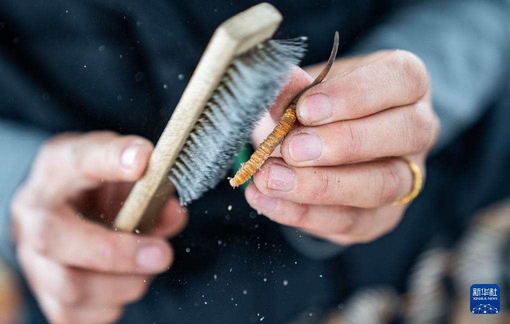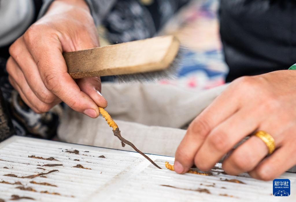 在那曲市索縣西昌鄉(xiāng),牧民白嘎在收納清理好的蟲草(5月18日攝)。新華社記者 丁增尼達(dá) 攝