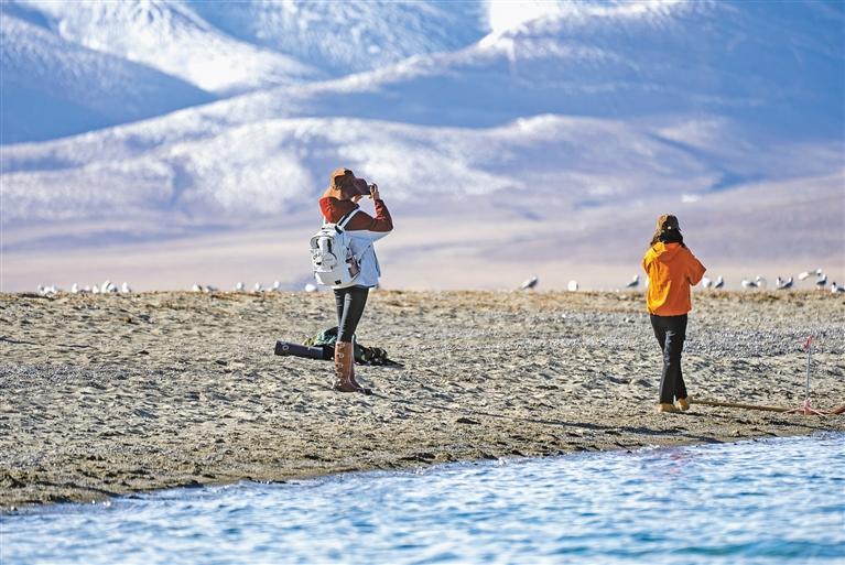游客在納木錯(cuò)打卡拍照。記者 阿旺尼瑪 貢曲羅杰 攝