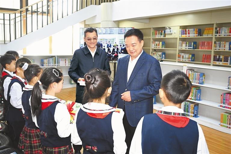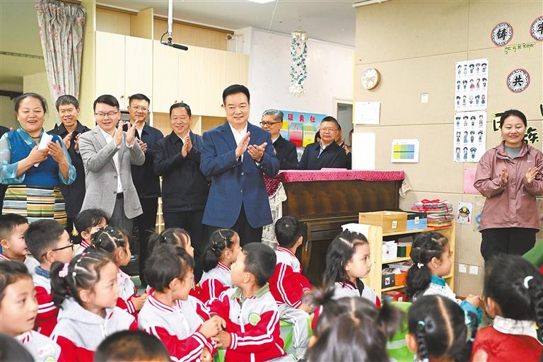 初夏,萬(wàn)物并秀,生機(jī)勃發(fā),拉薩市實(shí)驗(yàn)小學(xué)書聲瑯瑯。王君正走進(jìn)校園,察看學(xué)校環(huán)境,參觀自然、閱讀、書法、體育等教育成果展示,了解學(xué)校歷史沿革、建設(shè)發(fā)展、教育教學(xué)等情況。他指出,習(xí)近平總書記高度重視、親切關(guān)懷少年兒童和少先隊(duì)工作,多次參加少先隊(duì)活動(dòng),發(fā)表重要講話、作出重要指示。5月27日,習(xí)近平總書記致信祝賀中國(guó)少年先鋒隊(duì)第九次全國(guó)代表大會(huì)召開,殷切寄語(yǔ)廣大少年兒童,飽含著對(duì)大家的深切關(guān)愛(ài)。要加強(qiáng)愛(ài)國(guó)主義教育,講好思政課,著力講好黨的故事、革命的故事、英雄的故事,時(shí)刻把祖國(guó)和人民放在心中,不忘初心、童心向黨,從小聽黨話、感黨恩、跟黨走;要積極推廣國(guó)家通用語(yǔ)言文字,把鑄牢中華民族共同體意識(shí)根植少年兒童心靈深處,引導(dǎo)他們爭(zhēng)做民族團(tuán)結(jié)的小石榴籽,爭(zhēng)當(dāng)學(xué)習(xí)和踐行社會(huì)主義核心價(jià)值觀的小模范。圖書館內(nèi),“紅領(lǐng)巾小書蟲”讀書分享活動(dòng)正在進(jìn)行,孩子們圍坐在一起,與定日縣長(zhǎng)所鄉(xiāng)完全小學(xué)學(xué)生視頻連線,共同分享喜歡的書籍,王君正認(rèn)真傾聽、親切詢問(wèn),向孩子們贈(zèng)送書籍?!白鎳?guó)的未來(lái)和希望在你們身上,要熱愛(ài)祖國(guó)、好好學(xué)習(xí)、天天向上,從小培養(yǎng)良好的道德情操?!蓖蹙膭?lì)他們說(shuō),要多讀書、讀好書,從書中汲取智慧和營(yíng)養(yǎng),將來(lái)做對(duì)國(guó)家、對(duì)人民、對(duì)社會(huì)有用的人。