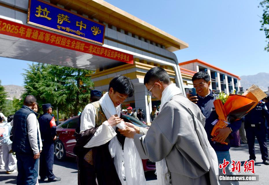 6月9日,西藏拉薩江蘇實驗中學(xué)考點外親友為考生送上哈達。當日,西藏自治區(qū)2025年普通高考完成所有科目考試,2025年西藏高考落下帷幕。中新社記者 貢嘎來松 攝