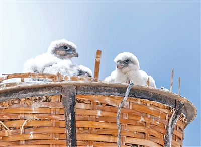 在鷹架上的巢中棲息的游隼雛鳥。新華社記者 旦增尼瑪曲珠攝