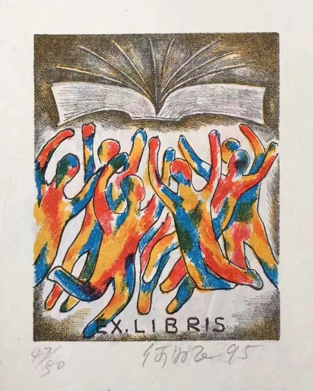 何為民創(chuàng)作的套色石版畫藏書票,該作品曾獲全國(guó)第六屆藏書票展銀獎(jiǎng)。受訪者供圖