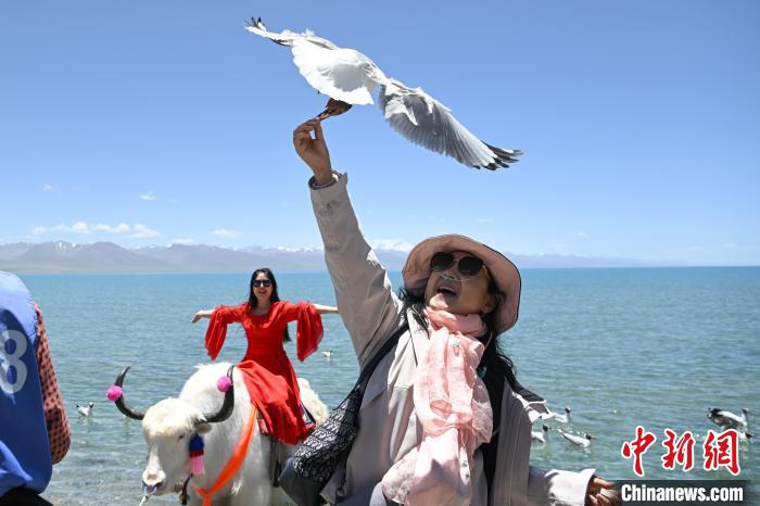6月26日,隨著氣溫逐漸升高,西藏納木錯迎來旅游旺季。納木錯,藏語意為“天湖”,位于西藏自治區(qū)中部,拉薩市當雄縣和那曲市班戈縣之間,面積超2000平方公里,湖面海拔4718米,是世界海拔最高的大型咸水湖。圖為游客在納木錯湖邊拍照留念。中新社記者 貢嘎來松 攝