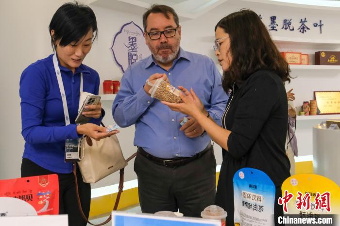 圖為6月28日,智利駐華大使巴勃羅·阿里亞蘭(中)在林芝經(jīng)濟(jì)開發(fā)區(qū)參訪時品嘗青稞食品。中新社記者 江飛波 攝
