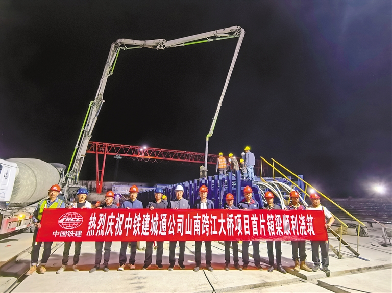 中鐵建城通公司山南跨江大橋項(xiàng)目首片箱梁順利澆筑合影。記者 武沛濤