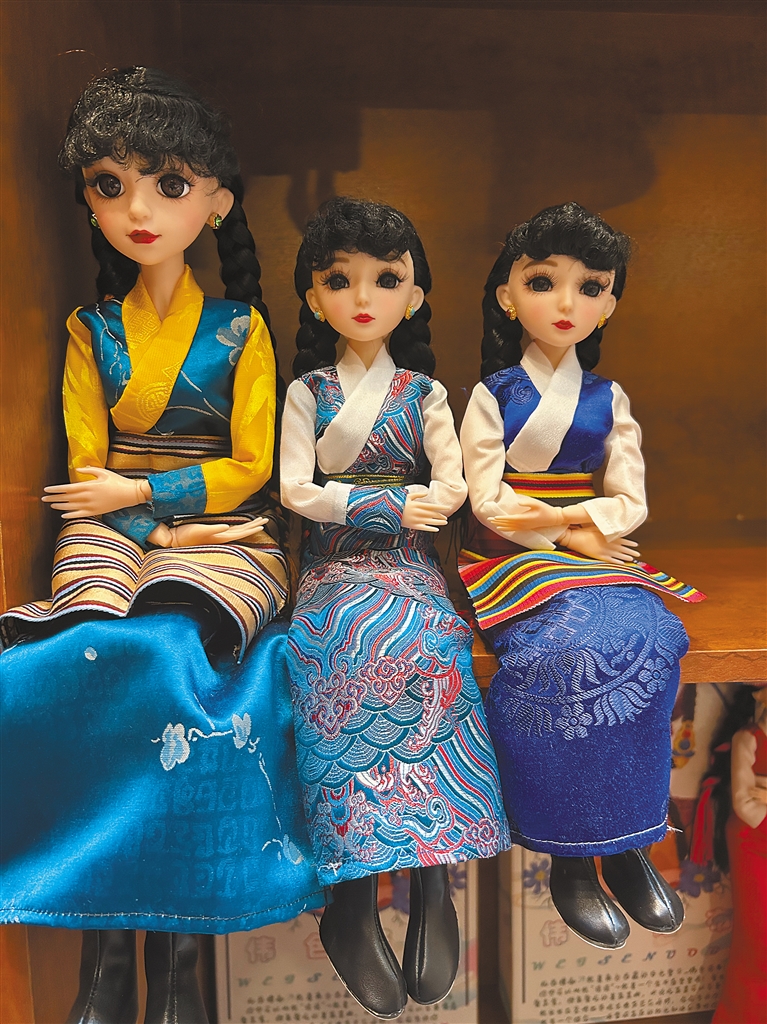 當行至二樓文創(chuàng)區(qū),一隅活力景象,驟然點亮歷史的深沉,一排排“拉颯姑娘”布娃娃,身著華麗藏裝靜靜佇立,吸引游客駐足流連。