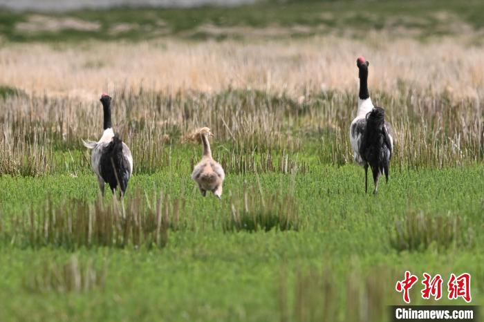 7月10日,在海拔4700米的西藏自治區(qū)那曲市申扎縣濕地里,黑頸鶴一家在悠閑覓食。黑頸鶴是中國國家一級重點(diǎn)保護(hù)野生動物,屬高原特有鶴類,主要棲息于海拔2500米至5000米的高原沼澤地、湖泊及河灘等濕地環(huán)境。每年四月起,成對的黑頸鶴陸續(xù)飛抵西藏自治區(qū)那曲市申扎縣,在此繁育后代。近年來,申扎縣持續(xù)加強(qiáng)生態(tài)修復(fù),濕地面積擴(kuò)大、水質(zhì)改善,為黑頸鶴等珍稀物種提供了理想家園。中新社發(fā) 毛建軍 攝