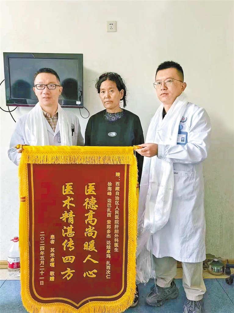 第九、十批北京協(xié)和醫(yī)院援藏醫(yī)生徐海峰(左)接受出院患者贈送的錦旗(資料圖片)。