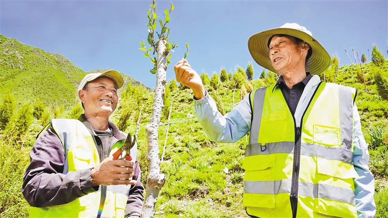 在2號(hào)片區(qū),一支特殊養(yǎng)護(hù)隊(duì)伍映入眼簾。十幾位藏族村民在技術(shù)員的指導(dǎo)下修剪枝條,掌握技術(shù)后將成為專業(yè)管護(hù)人員。村民的動(dòng)作略顯生疏,但專注的神情流露出對(duì)樹苗的珍視。