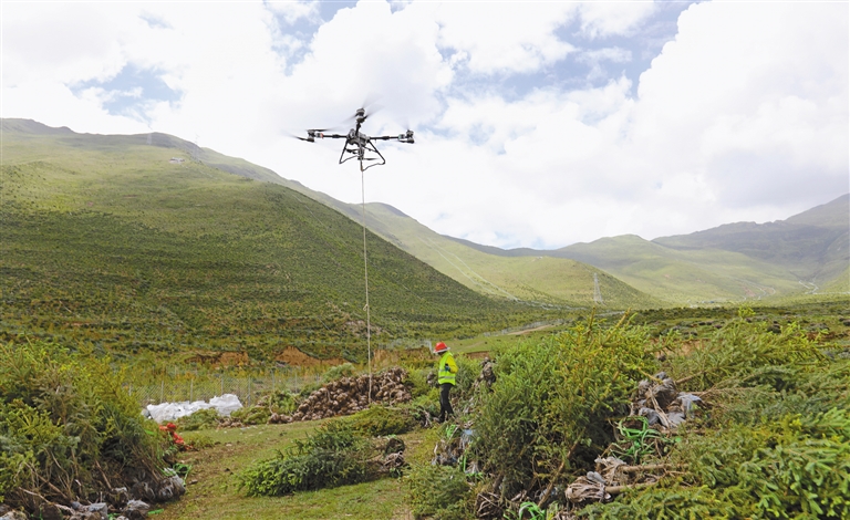 南北山綠化工程墨竹工卡縣段11號(hào)片區(qū)無人機(jī)在運(yùn)送苗木。
