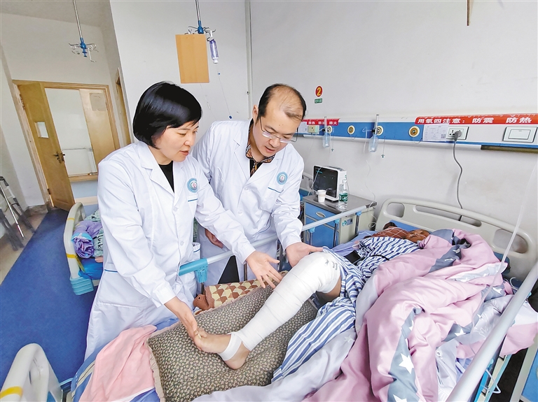 青島市市立醫(yī)院援藏醫(yī)生徐文龍(右)指導(dǎo)患者進行術(shù)后康復(fù)訓(xùn)練。青島援藏干部王建亮提供