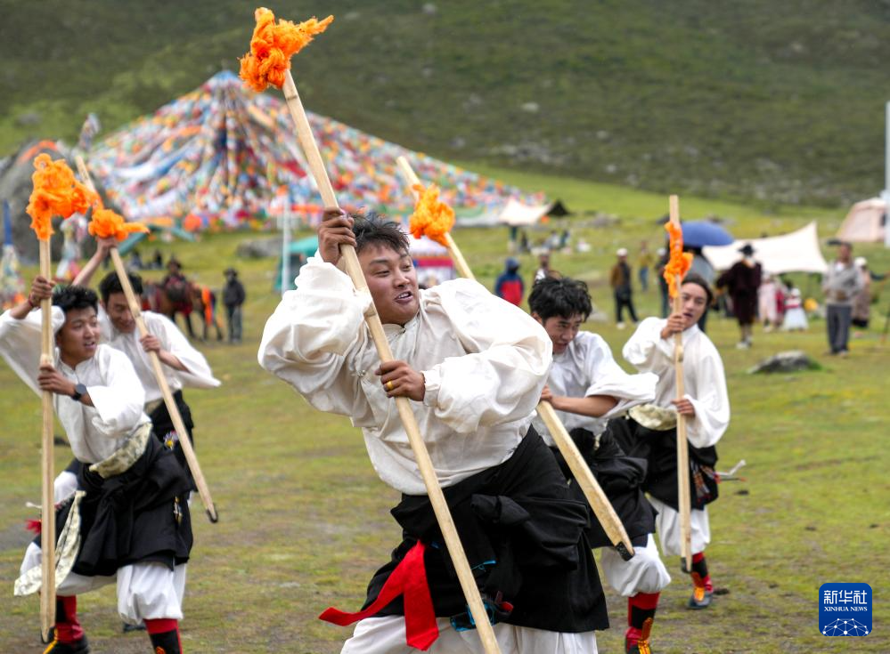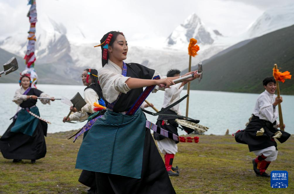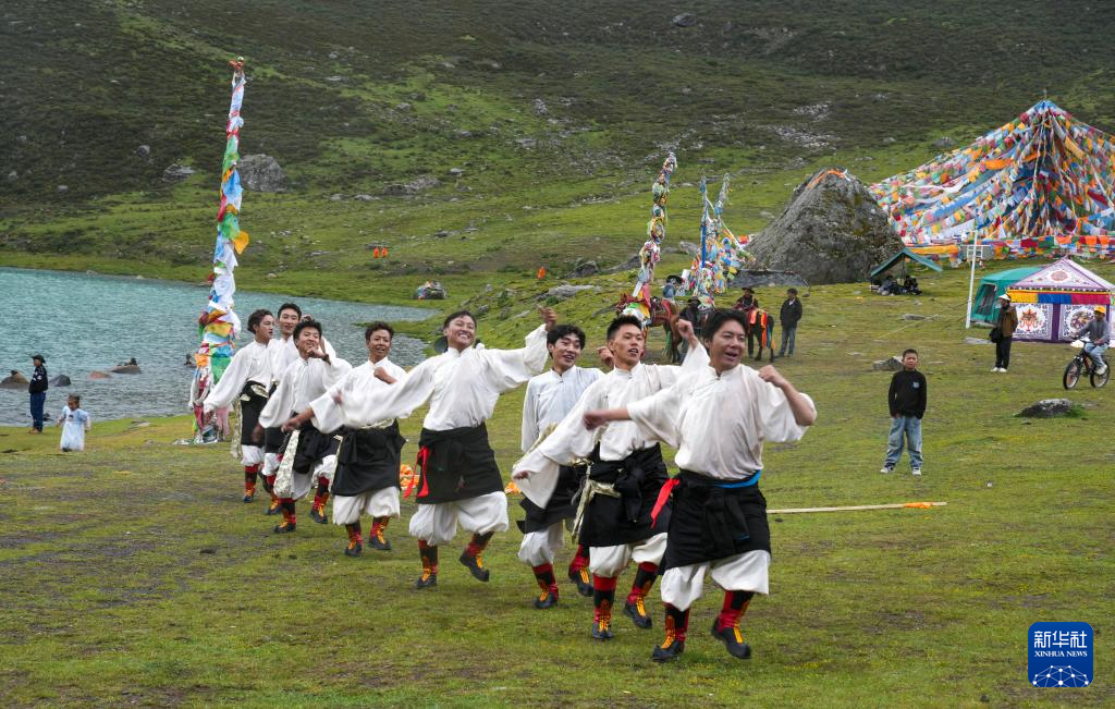 西藏那曲市比如縣藝術(shù)團(tuán)的演員在薩普雪山景區(qū)為游客表演國家級非物質(zhì)文化遺產(chǎn)舞蹈“達(dá)布阿諧”(7月19日攝)。這是該藝術(shù)團(tuán)今年在景區(qū)開展的第6場非遺展演活動(dòng)。新華社記者 晉美多吉 攝