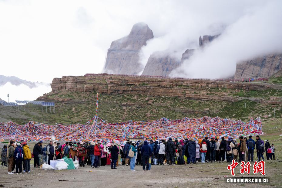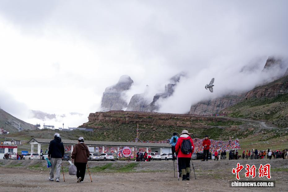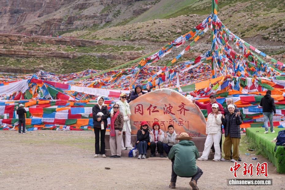 7月21日,游客在岡仁波齊山腳下的經(jīng)幡廣場打卡拍照。岡仁波齊位于西藏阿里地區(qū)普蘭縣境內(nèi),是岡底斯山的主峰,也是藏傳佛教的神山之一,每年吸引眾多信徒前往轉(zhuǎn)山,并衍生出徒步旅行的經(jīng)典路線。每年來自國內(nèi)外的徒步旅行者為當(dāng)?shù)貏?chuàng)造就業(yè)機會的同時,也推動了文旅產(chǎn)業(yè)的發(fā)展。中新社記者 張祥毅 攝
