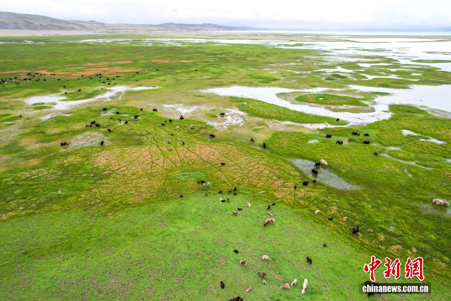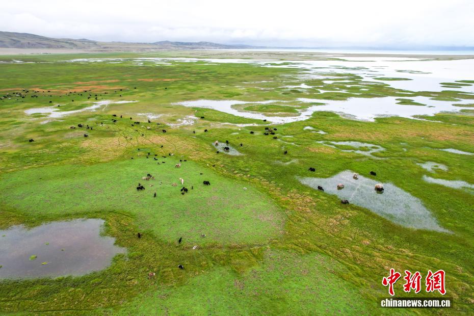 7月22日,在西藏阿里地區(qū)普蘭縣霍爾鄉(xiāng),牧民在瑪旁雍錯(cuò)濕地上放牧牦牛。為實(shí)現(xiàn)更大的經(jīng)濟(jì)效益,霍爾鄉(xiāng)近年來(lái)探索建立牦牛養(yǎng)殖專業(yè)合作社,按當(dāng)?shù)刈匀粭l件合理分配牦牛放牧地點(diǎn),并將牛奶進(jìn)行加工銷售,2023年該合作社的年總收入達(dá)到60余萬(wàn)元人民幣,帶動(dòng)牧民人均增收2萬(wàn)余元人民幣。(無(wú)人機(jī)照片)中新社記者 張祥毅 攝