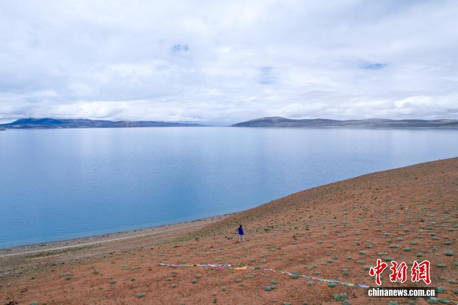 7月22日,游客游覽拉昂錯。瑪旁雍錯與拉昂錯位于西藏阿里地區(qū)普蘭縣境內(nèi),兩湖僅有一堤之隔,卻擁有不同的地理特征和咸淡水之分,因而分別被譽為“圣湖”與“鬼湖”。每年夏天,兩湖與附近的岡仁波齊一道,吸引眾多游客前來賞景游覽。(無人機照片)中新社記者 張祥毅 攝