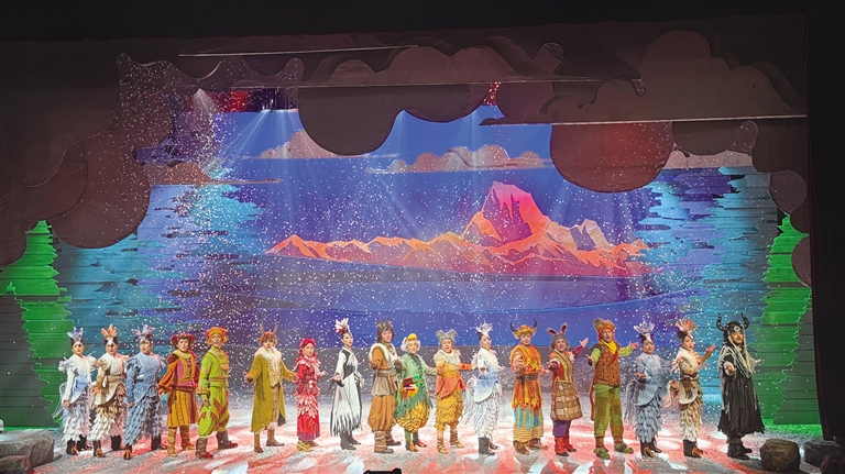在《高原上的精靈》舞臺上,西藏傳統(tǒng)樂器的韻律與生態(tài)寓言相互交織。當(dāng)弦子、鷹笛和扎念琴的聲音劃破夜空時,小觀眾們已沉浸其中。藏戲溫巴的藍(lán)面具在聚光燈下浮現(xiàn),藏戲特有的說唱調(diào)式如雪山融水般流淌……《高原上的精靈》以80分鐘的音樂劇形式突破傳統(tǒng)話劇的敘事框架,這種形式選擇源于深刻的兒童心理洞察——音樂劇特有的歌舞敘事能持續(xù)刺激視覺與聽覺神經(jīng),避免低齡觀眾對純對白場景產(chǎn)生倦怠感。