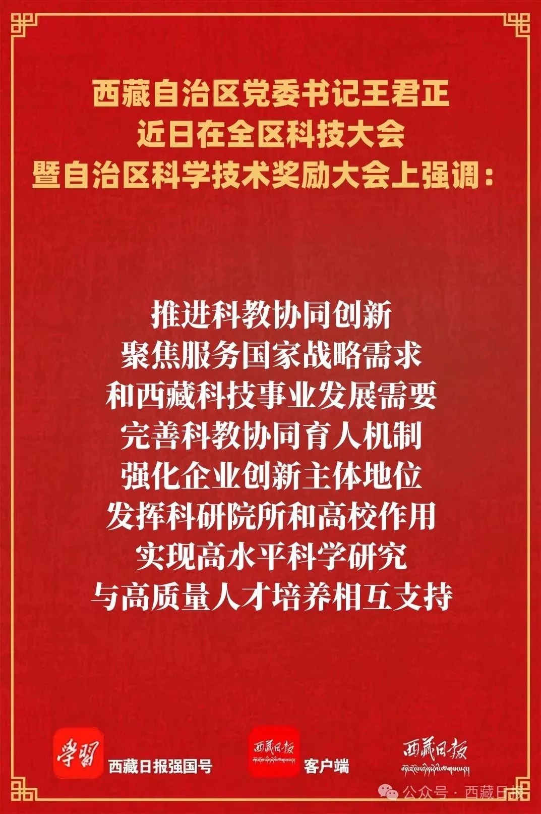 王君正代表自治區(qū)黨委、政府,向全體獲獎人員和單位表示祝賀,向廣大科技工作者為西藏長治久安和高質(zhì)量發(fā)展作出的積極貢獻致以崇高敬意和衷心感謝。他指出,黨的十八大以來,以習(xí)近平同志為核心的黨中央高度重視科技事業(yè)發(fā)展,習(xí)近平總書記從黨和國家發(fā)展戰(zhàn)略全局的高度,對科技創(chuàng)新進行頂層謀劃和系統(tǒng)部署,有力推進科技自立自強,我國科技事業(yè)取得歷史性成就、發(fā)生歷史性變革。2024年6月,習(xí)近平總書記在全國科技大會、國家科學(xué)技術(shù)獎勵大會、兩院院士大會上發(fā)表重要講話,為做好新時代科技工作進一步指明了前進方向、提供了根本遵循。全區(qū)各級各部門要認真貫徹落實習(xí)近平總書記重要指示精神,深刻認識科技創(chuàng)新是推動經(jīng)濟高質(zhì)量發(fā)展的核心動力、是實現(xiàn)人民高品質(zhì)生活的現(xiàn)實需要、是建設(shè)社會主義現(xiàn)代化新西藏的戰(zhàn)略支撐,進一步增強責(zé)任感使命感緊迫感,加快推進科技創(chuàng)新,為推動西藏長治久安和高質(zhì)量發(fā)展作出新貢獻。