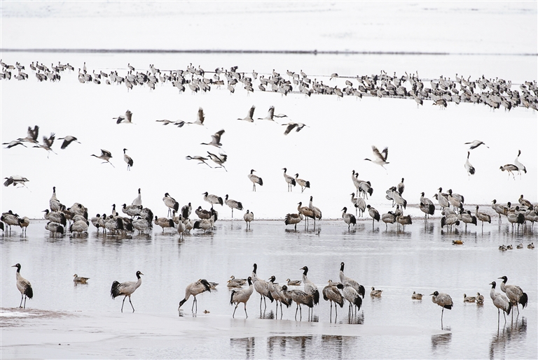 “2018年申扎濕地公園建成后,每年都會(huì)有黑頸鶴來(lái)到這里養(yǎng)育寶寶?!闭谏⒉降木用癍傔_(dá)笑著告訴記者,“黑頸鶴是申扎縣的‘明星’,也是申扎縣良好生態(tài)的一張名片。我們爭(zhēng)當(dāng)黑頸鶴的保護(hù)者,顯然黑頸鶴也把我們當(dāng)作它們的好朋友了。”
