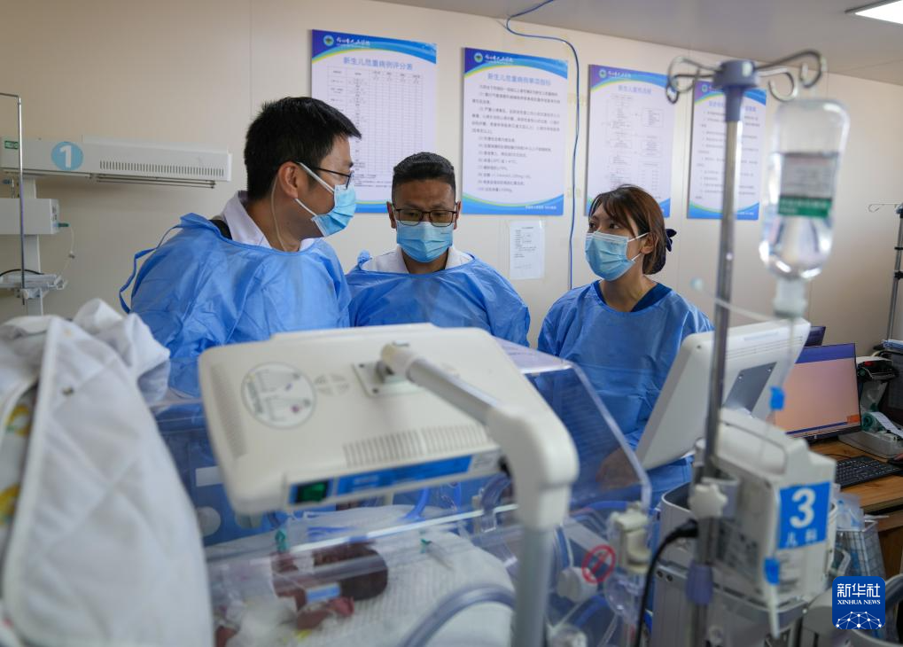 在那曲市人民醫(yī)院新生兒重癥監(jiān)護室,來自大連醫(yī)科大學附屬第一醫(yī)院的援藏醫(yī)生田聰亮(左)與吉美多布杰(中)、護士旦珍合作,為一名早產(chǎn)兒實施機械通氣治療(7月18日攝)。吉美多布杰2003年從四川大學華西醫(yī)學院畢業(yè)來到那曲市人民醫(yī)院工作,他先后和8批援藏專家合作、學習。新華社記者 晉美多吉 攝