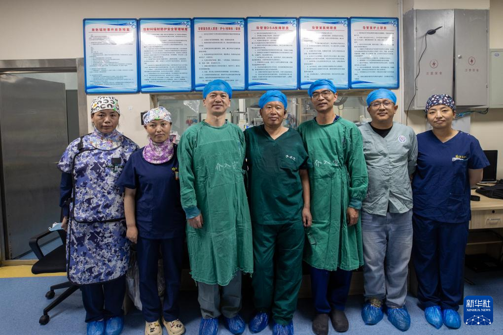 協(xié)和醫(yī)院第十批援藏醫(yī)生王強(右三)、第十一批援藏醫(yī)生蔣青偉(左三)和西藏自治區(qū)人民醫(yī)院醫(yī)生扎西(中)、旦增索朗(右二)及手術(shù)團隊,在拉薩為患者施行內(nèi)鏡逆行胰膽管造影術(shù)后合影(8月5日攝)。新華社記者 姜帆 攝