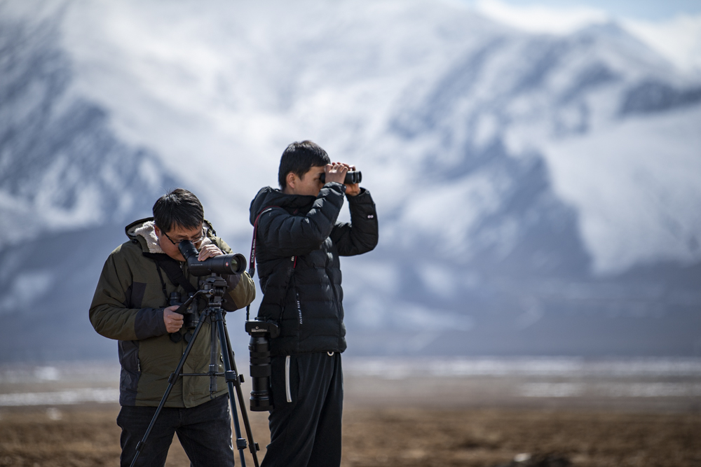2023年3月1日,在拉薩市林周縣,楊樂(lè)(左)和同事正在觀察田間覓食的黑頸鶴。新華社記者孫非 攝