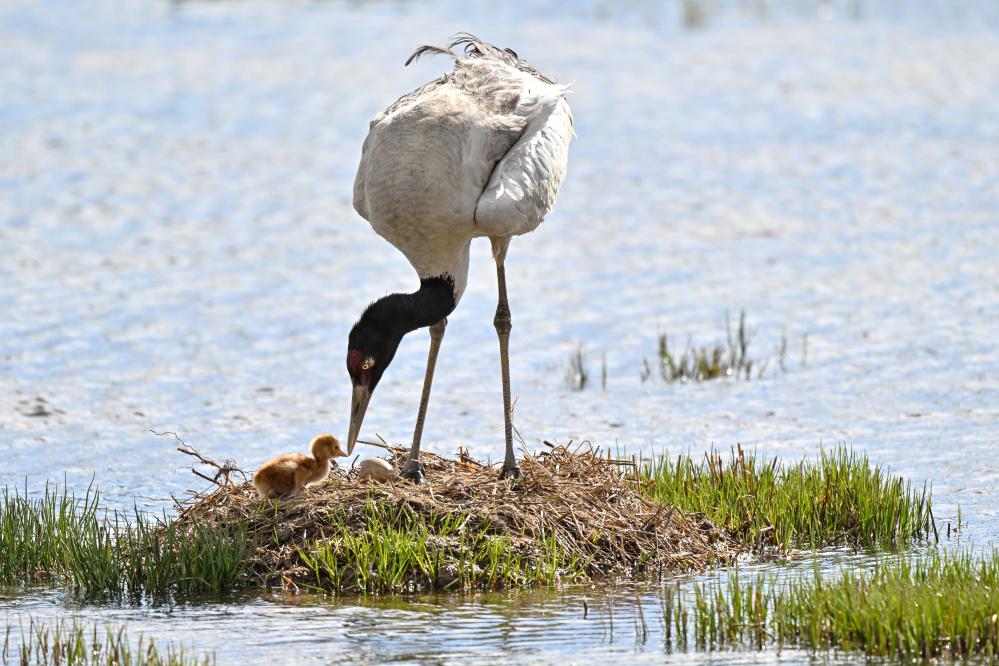 2025年6月5日,這是在西藏那曲市申扎縣拍攝的黑頸鶴和雛鳥(niǎo)。新華社記者孫瑞博 攝